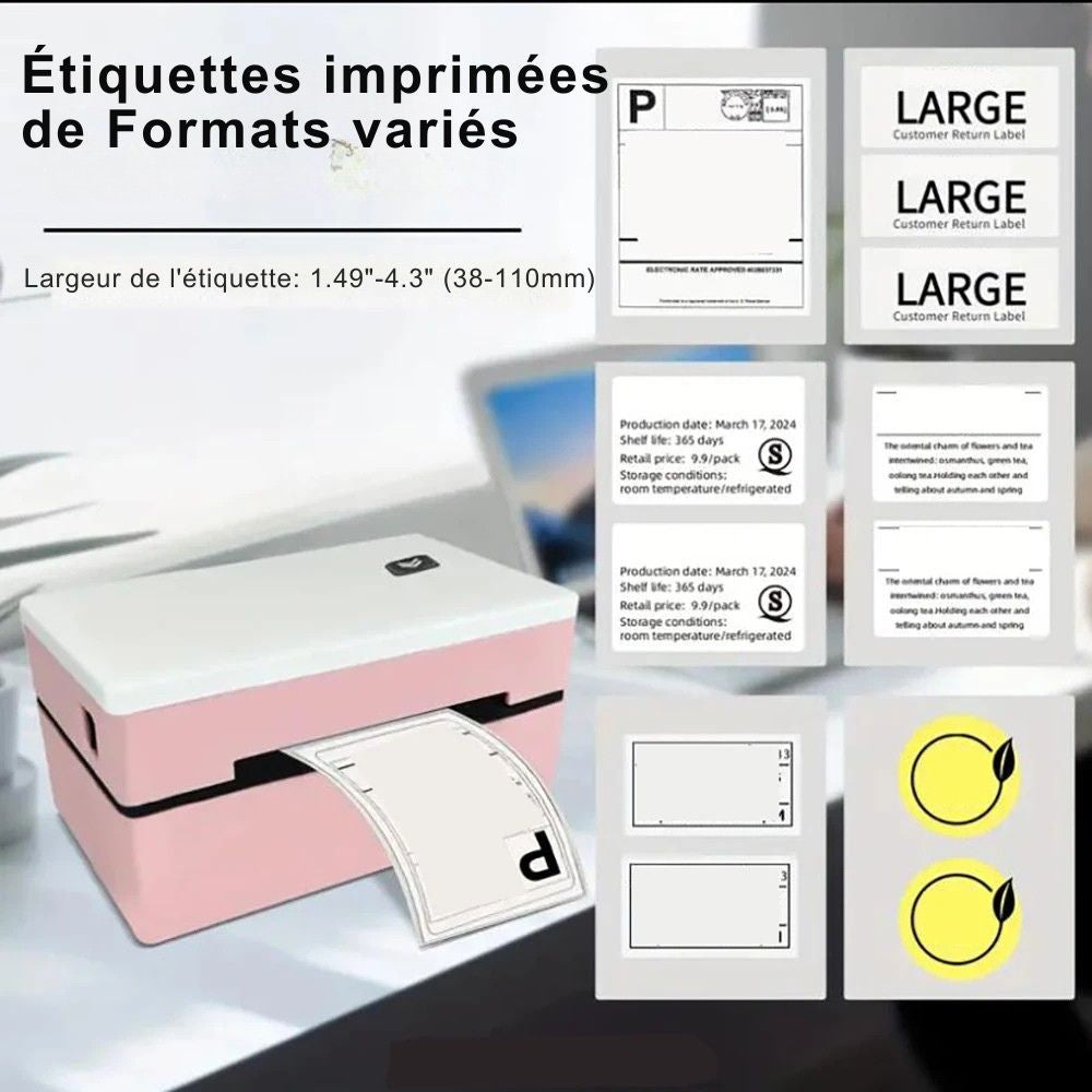 Compatible avec étiquettes en rouleaux ou en éventail, largeur de 48 à 104 mm. Idéale pour les colis de petites entreprises en ligne.